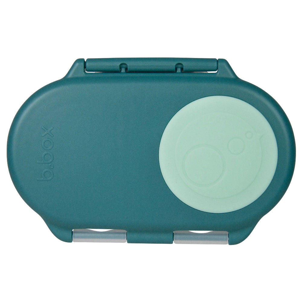 The B.Box Snack Box - Emerald Forest makes snack time easy with toxin-free material, spacious leakproof compartments and easy open/close grips. It even includes a whole fruit holder to secure small, whole fruits in place, meaning no more cut fruit or soggy, bruised snacks. Perfect for taking on car trips, visits to the park and kindy.